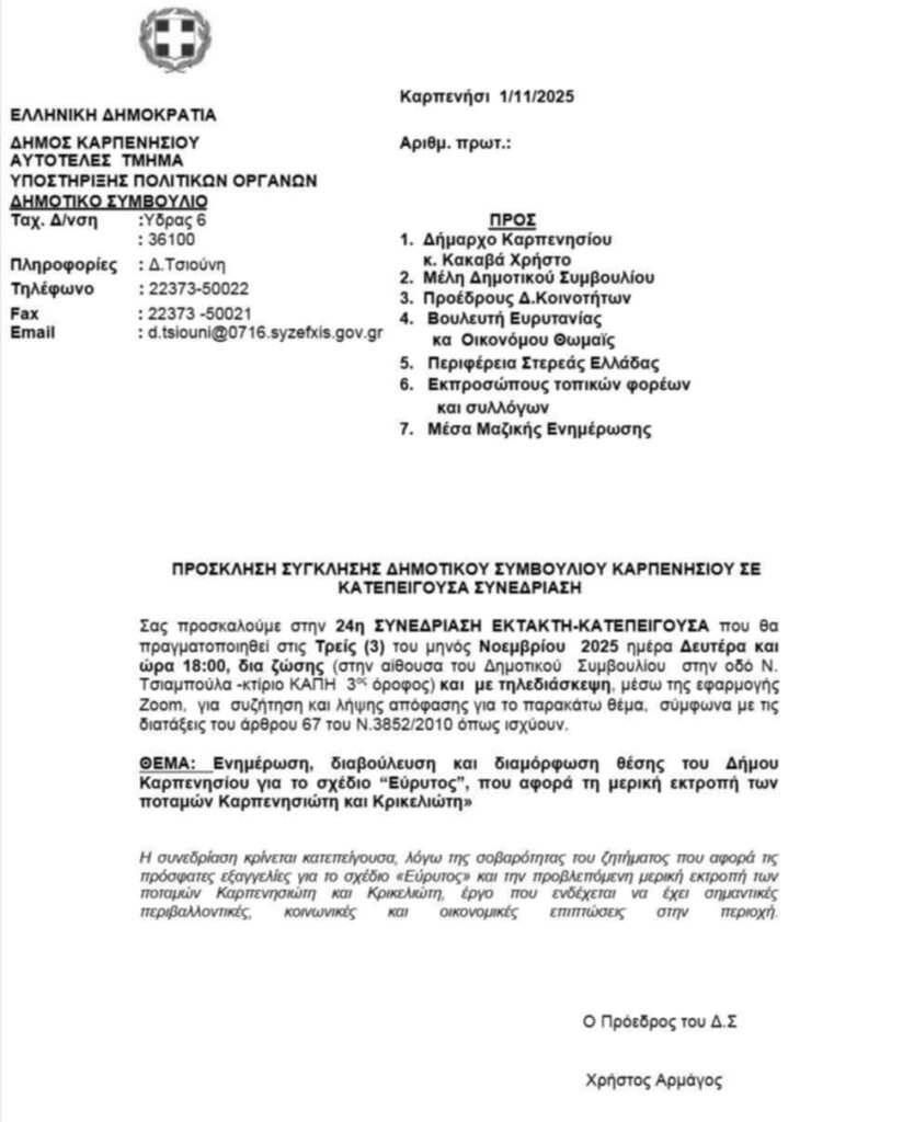 Σε κατεπείγουσα συνεδρίαση συγκαλείται το Δημοτικό Συμβούλιο Καρπενησίου τη Δευτέρα 3 Νοεμβρίου 2025, με αποκλειστικό θέμα το σχέδιο «Εύρυτος» και τη σχεδιαζόμενη μερική εκτροπή των ποταμών Καρπενησιώτη και Κρικελιώτη προς τον Εύηνο, έργο που η κυβέρνηση έχει εντάξει στις εθνικές προτεραιότητες για την ενίσχυση της υδροδότησης της Αττικής.