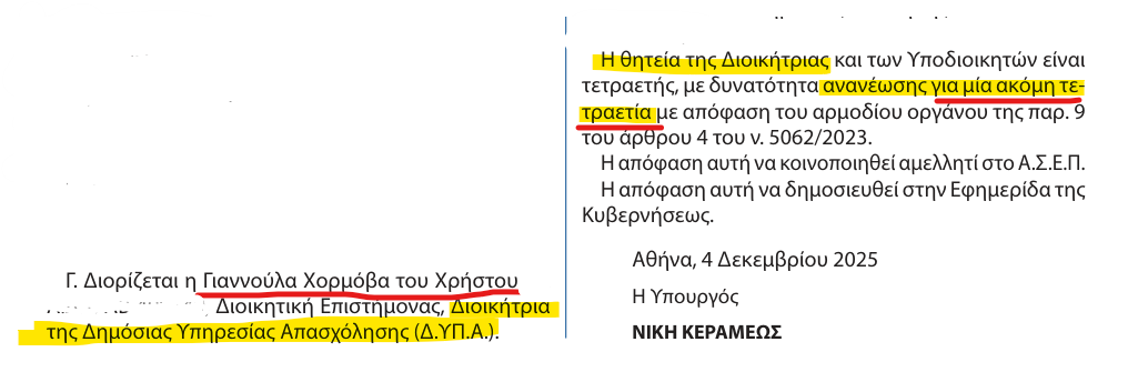 Στην Εφημερίδα της Κυβερνήσεως δημοσιεύθηκε η απόφαση της υπουργού κ. Νίκης Κεραμέως για την ανανέωση της θητείας της Καρπενησιώτισσας Γιάννας Χορμόβα στη διοίκηση της Δημόσιας Υπηρεσίας Απασχόλησης. Η ανανέωση αφορά νέα τετραετή θητεία, επιβεβαιώνοντας τη συνέχιση της παρουσίας της στην ίδια θέση.