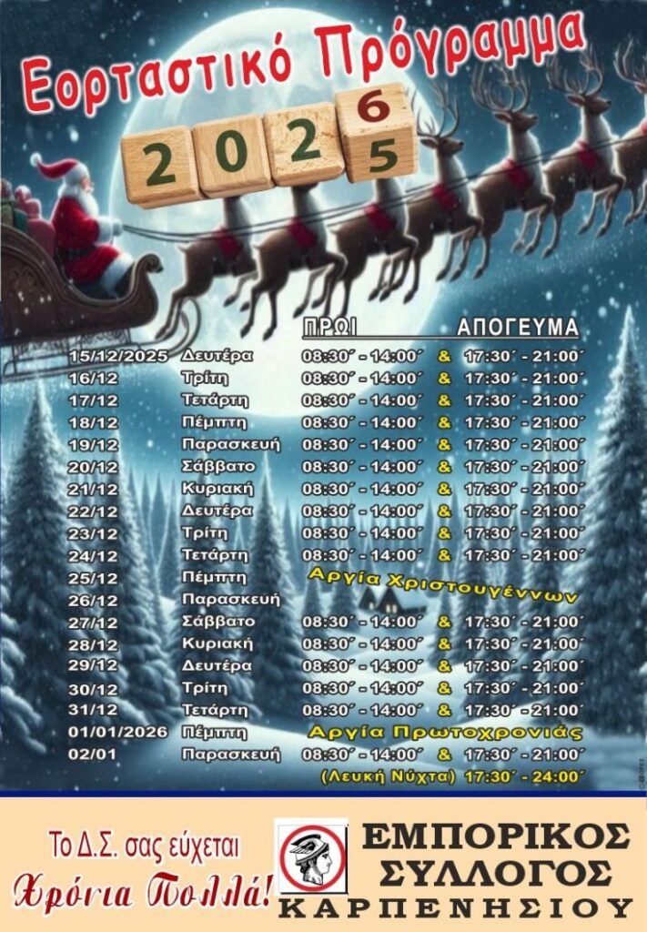Με το εορταστικό πρόγραμμα λειτουργίας των καταστημάτων να έχει τεθεί πλέον σε ισχύ, η αγορά του Καρπενησίου μπαίνει σταδιακά σε ρυθμούς Χριστουγέννων. Σύμφωνα με το πρόγραμμα του Εμπορικού Συλλόγου Καρπενησίου, τα καταστήματα θα λειτουργούν με διευρυμένο ωράριο τόσο τις καθημερινές όσο και τα Σαββατοκύριακα.