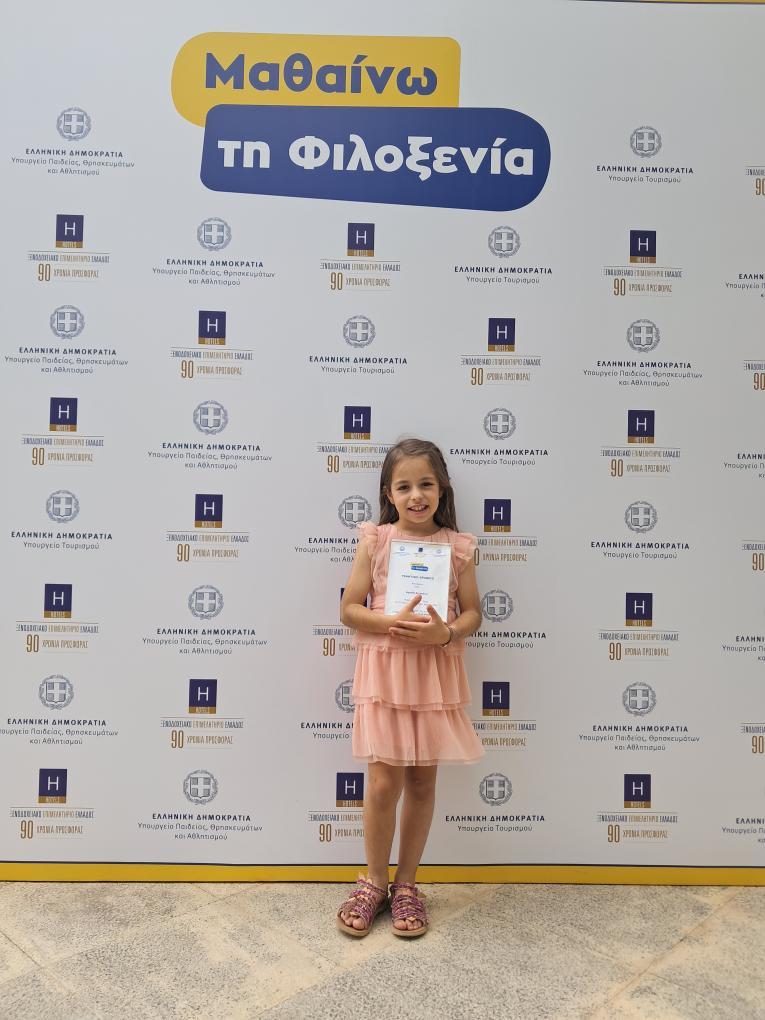 Βραβείο πανελλήνιας διάκρισης απέσπασε η μικρή Αγαθή Σαπούνη, μαθήτρια της Α’ τάξης του 3ου Δημοτικού Σχολείου Καρπενησίου, στον 1ο Πανελλήνιο Μαθητικό Διαγωνισμό Ζωγραφικής Δημοτικών Σχολείων με τίτλο «Ζωγραφίζω τη Φιλοξενία», που διοργάνωσε το Ξενοδοχειακό Επιμελητήριο Ελλάδος (ΞΕΕ). Η ζωγραφιά της ξεχώρισε ανάμεσα σε 2.300 συμμετοχές από όλη τη χώρα και επιλέχθηκε ως μία από τις τρεις καλύτερες της Α’ Δημοτικού, σε έναν διαγωνισμό που στόχο είχε να εμπνεύσει τα παιδιά γύρω από την έννοια της φιλοξενίας, μέσα από τη δημιουργική έκφραση.