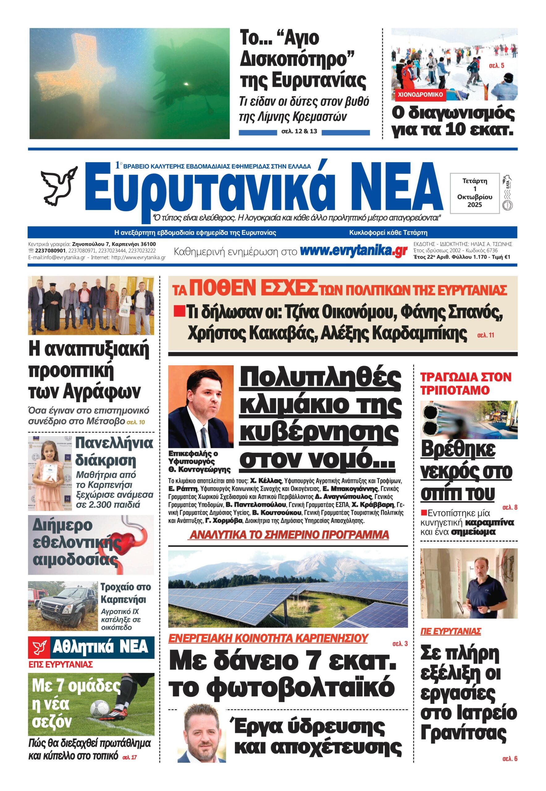 Διαβάστε στα “Ευρυτανικά Νέα” που κυκλοφορούν – Τα κυριότερα θέματα στο πρωτοσέλιδο της 1ης Οκτωβρίου 1 Οκτωβρίου 2025