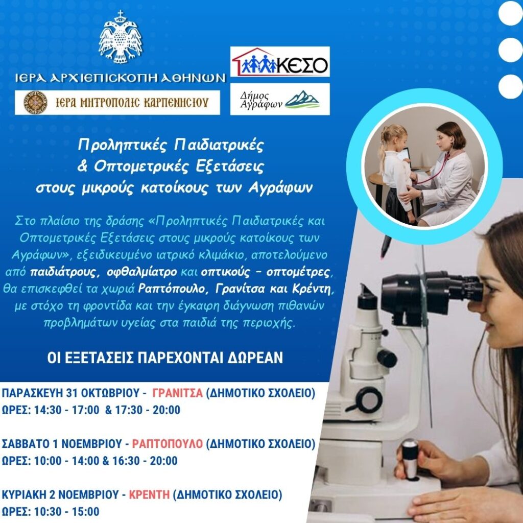 Μια ουσιαστική κοινωνική πρωτοβουλία φέρνει η Ιερά Αρχιεπισκοπή Αθηνών και η Ιερά Μητρόπολη Καρπενησίου σε συνεργασία με τον Δήμο Αγράφων, με στόχο τη φροντίδα της παιδικής υγείας σε απομακρυσμένες περιοχές. Από την Παρασκευή 31 Οκτωβρίου έως την Κυριακή 2 Νοεμβρίου 2025, εξειδικευμένο ιατρικό κλιμάκιο θα πραγματοποιήσει δωρεάν προληπτικές παιδιατρικές και οπτομετρικές εξετάσεις για παιδιά στα χωριά Γρανίτσα, Ραπτόπουλο και Κρέντη.