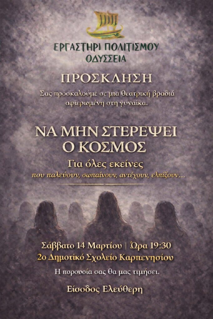 Με αφορμή την Παγκόσμια Ημέρα της Γυναίκας, το Εργαστήρι Πολιτισμού ΟΔΥΣΣΕΙΑ παρουσιάζει το Σάββατο 14 Μαρτίου, στις 19:30, στο 2ο Δημοτικό Σχολείο Καρπενησίου, το θεατρικό αφιέρωμα με τίτλο «Να μην στερέψει ο κόσμος».
