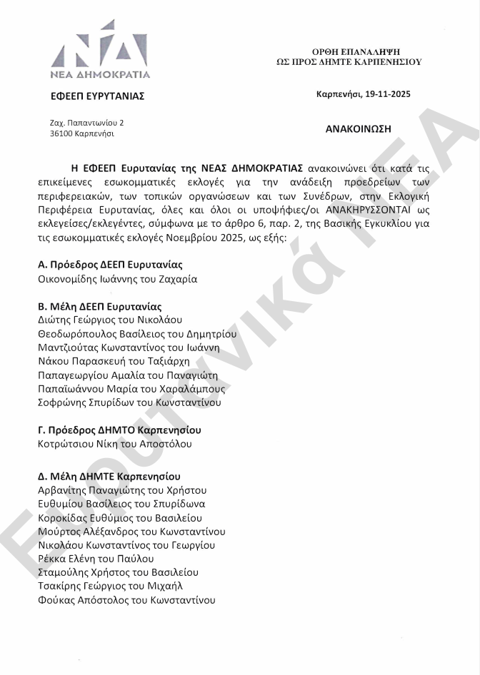 Σύμφωνα με την ανακοίνωση, στην Εκλογική Περιφέρεια Ευρυτανίας όλοι οι υποψήφιοι ανακηρύσσονται ως εκλεγέντες, στη βάση του άρθρου 6, παράγραφος 2, της Βασικής Εγκυκλίου για τις εσωκομματικές εκλογές του Νοεμβρίου 2025.