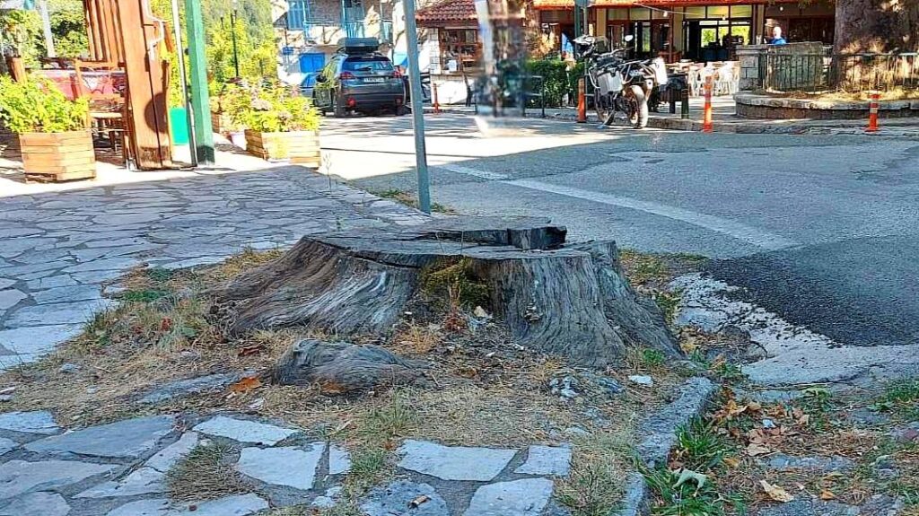 Η αρχή έγινε το 2020, με τον πλάτανο που βρισκόταν δεξιά στην έξοδο προς τη Σκοπιά. Το 2023 ακολούθησε το δέντρο μπροστά από το κατάστημα Παπαδημητρίου, το οποίο κόπηκε μερικώς, για να αποτελέσει παρελθόν φέτος, μαζί με εκείνον που στόλιζε τον ξενώνα της πλατείας. Σήμερα, ο πλάτανος δίπλα στη βρύση εμφανίζει σημάδια νόσου και είναι πολύ πιθανό να έχει την ίδια κατάληξη.