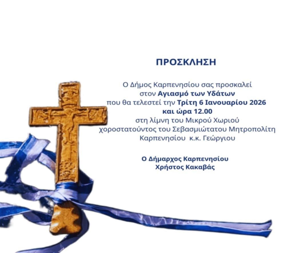 Στο Καρπενήσι, ο Δήμος προσκαλεί τους πολίτες στον Αγιασμό των Υδάτων που θα τελεστεί στη λίμνη του Μικρού Χωριού, την Τρίτη 6 Ιανουαρίου 2026 και ώρα 12:00. Η τελετή θα πραγματοποιηθεί με τη χοροστασία του Σεβασμιωτάτου Μητροπολίτη Καρπενησίου κ.κ. Γεωργίου, παρουσία της δημοτικής αρχής και κατοίκων.