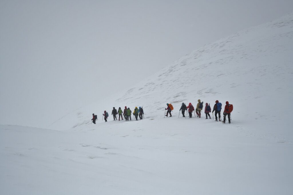 14:22 άφιξη / 14:45 αναχώρηση – Φθάνουμε στο πλάτωμα πριν την κορφή: Κρίσιμη ώρα 0:00. Μετριόμαστε ξανά, η ομάδα κορφής είμαστε 17. Η κορφή φαίνεται μπροστά μας (σε απόσταση περίπου 600m και 100m υψομετρική διαφορά). Ο Τάσος μένει τελευταίος (“σκούπα”). Ο καιρός έχει αλλάξει, πυκνή ομίχλη καλύπτει την περιοχή, φυσάει και χιονίζει, ωστόσο ο προσανατολισμός είναι εύκολος, προχωρούμε ευθεία και παράλληλα με τον γκρεμό στα δεξιά μας (ΝΔ).