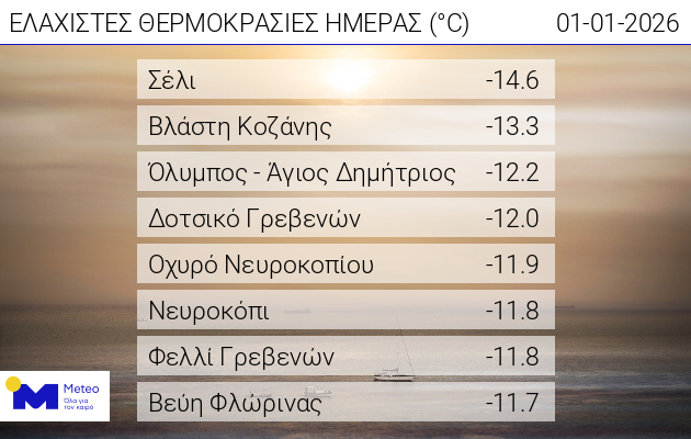 Ιδιαίτερα χαμηλές θερμοκρασίες καταγράφηκαν την Πρωτοχρονιά του 2026 σε μεγάλο μέρος της χώρας, με τον παγετό να κάνει αισθητή την παρουσία του κυρίως στα βόρεια ηπειρωτικά τμήματα. Σύμφωνα με τα στοιχεία του Εθνικού Αστεροσκοπείου Αθηνών / meteo.gr, η χαμηλότερη ελάχιστη θερμοκρασία σημειώθηκε στο Σέλι Ημαθίας, όπου το θερμόμετρο υποχώρησε στους -14,6 βαθμούς Κελσίου, ενώ σε ορεινές και κλειστές περιοχές, όπως δολίνες και χιονοδρομικά κέντρα, οι τιμές έπεσαν ακόμη χαμηλότερα, αγγίζοντας τους -20 βαθμούς στο Βαθύσταλο Παρνασσού και τους -16 στο Χιονοδρομικό Κέντρο Καϊμακτσαλάν.