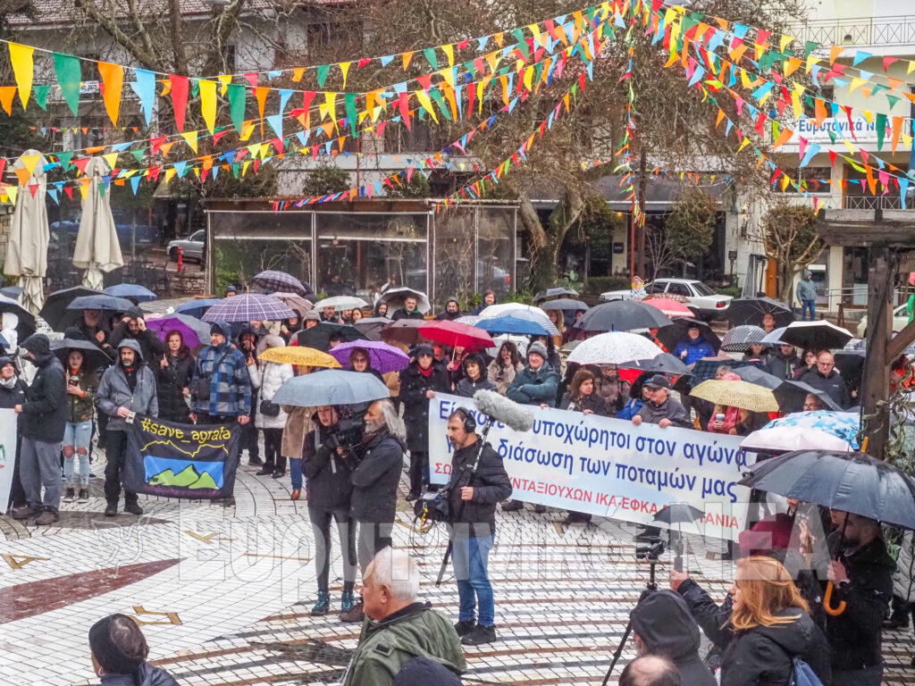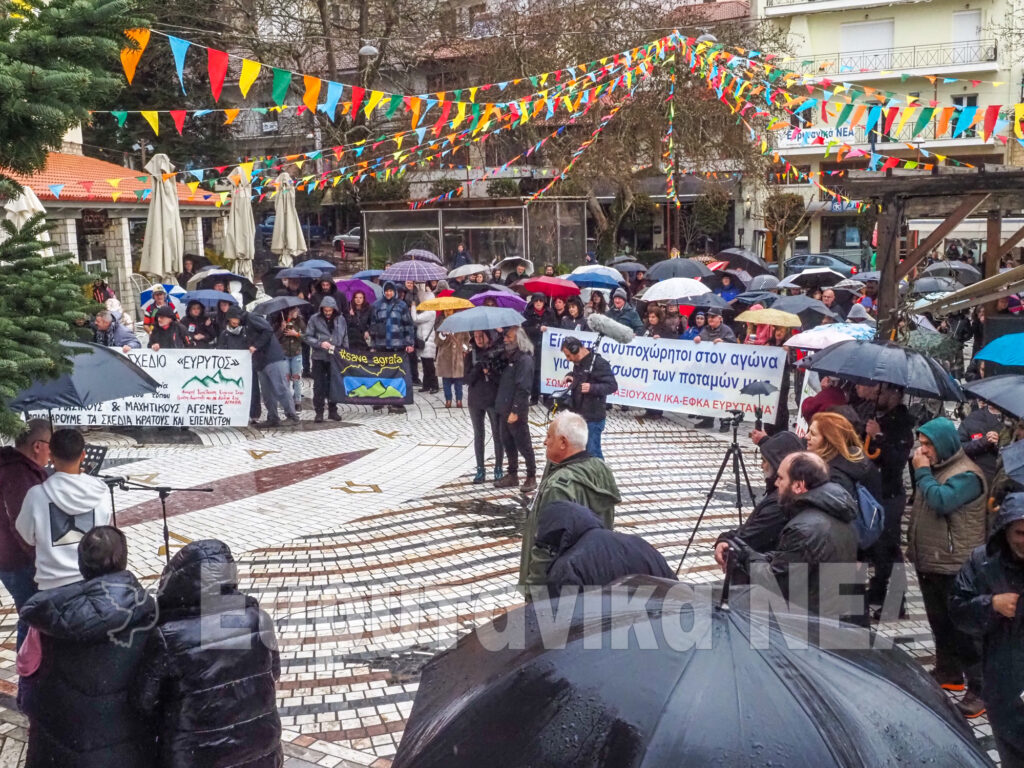 Παρά τη συνεχή βροχόπτωση, με τη συμμετοχή εκατοντάδων πολιτών πραγματοποιήθηκε το μεσημέρι της Κυριακής (8/2) στην κεντρική πλατεία Καρπενησίου το συλλαλητήριο ενάντια στο σχέδιο «Εύρυτος», που προβλέπει τη μερική εκτροπή υδάτινων πόρων της Ευρυτανίας προς την Αττική.