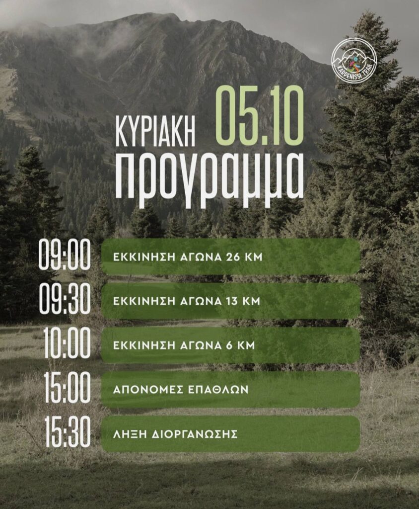 Η Κυριακή 5 Οκτωβρίου είναι αφιερωμένη στην αγωνιστική δράση. Στις 09:00 ξεκινά η μεγάλη διαδρομή των 26 χιλιομέτρων, στις 09:30 η μεσαία των 13 χιλιομέτρων και στις 10:00 η μικρή των 6 χιλιομέτρων. Το πρόγραμμα συνεχίζεται με τις απονομές επάθλων στις 15:00 και τη λήξη της διοργάνωσης στις 15:30. Σύμφωνα με τις μετεωρολογικές προβλέψεις, ο καιρός θα είναι σύμμαχος των δρομέων, στοιχείο που προδιαθέτει για ομαλή και επιτυχημένη διεξαγωγή. Το Karpenissi Trail, που χρόνο με τον χρόνο ενισχύει τη θέση του στον χώρο του ορεινού τρεξίματος, δίνει τη δυνατότητα σε δρομείς και επισκέπτες να γνωρίσουν το φυσικό πλούτο και τη φιλοξενία της περιοχής, αναδεικνύοντας ταυτόχρονα την Ευρυτανία ως προορισμό αθλητικού και εναλλακτικού τουρισμού.