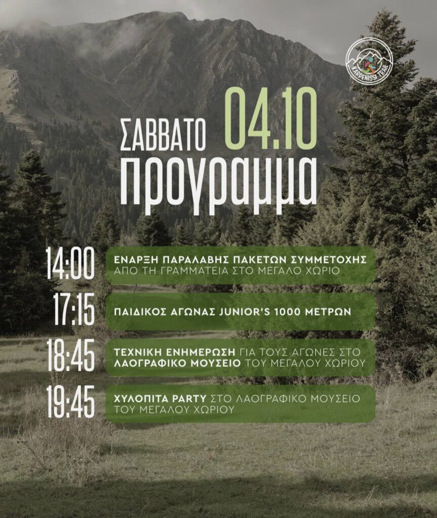 Σύμφωνα με το επίσημο πρόγραμμα, το Σάββατο (4/10), στις 14:00, ανοίγει η Γραμματεία για την παραλαβή των πακέτων συμμετοχής, ενώ στις 17:15 δίνεται η εκκίνηση στον παιδικό αγώνα Junior’s 1.000 μέτρων, δίνοντας στους μικρούς δρομείς την ευκαιρία να ζήσουν τη δική τους εμπειρία τρεξίματος. Στις 18:45 στο Λαογραφικό Μουσείο θα γίνει η τεχνική ενημέρωση των αγώνων, με χρήσιμες οδηγίες και λεπτομέρειες για τις διαδρομές. Η πρώτη μέρα θα κλείσει στις 19:45 με το καθιερωμένο «χυλοπίτα party».