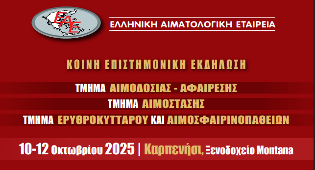 Το Καρπενήσι (ξενοδοχείο Μοντάνα) φιλοξενεί μια σημαντική επιστημονική εκδήλωση, καθώς από τις 10 έως τις 12 Οκτωβρίου 2025 θα πραγματοποιηθεί η κοινή εκδήλωση των τμημάτων Αιμοδοσίας-Αφαίρεσης, Αιμόστασης και Ερυθροκυττάρου & Αιμοσφαιρινοπαθειών της Ελληνικής Αιματολογικής Εταιρείας.