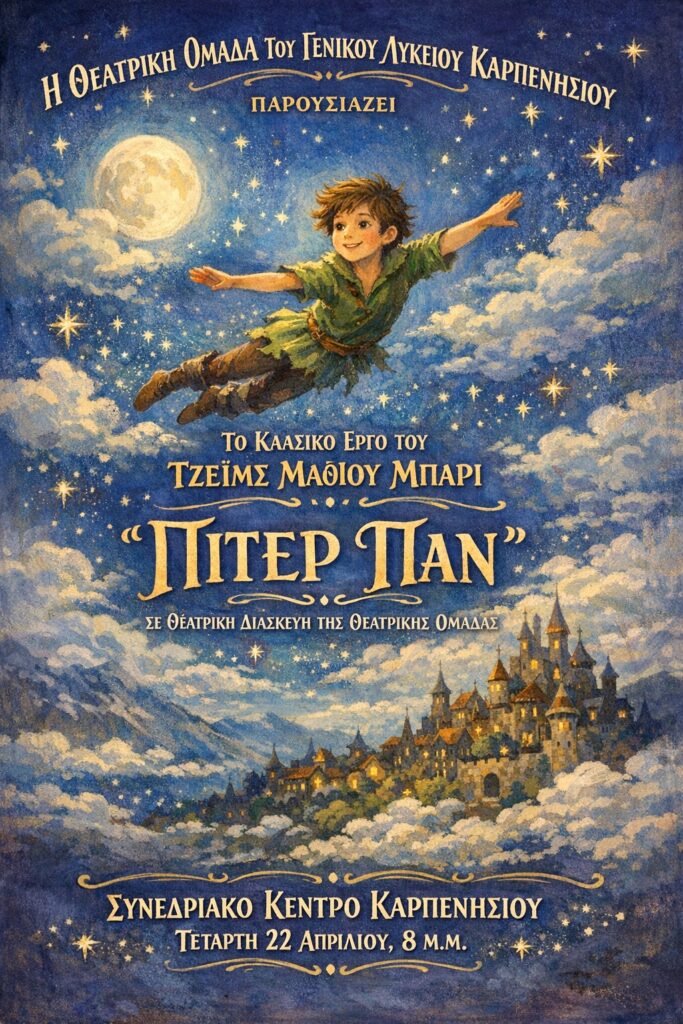 Η Θεατρική Ομάδα του Γενικού Λυκείου Καρπενησίου παρουσιάζει το κλασικό έργο του Τζέιμς Μάθιου Μπάρι «Πίτερ Παν», σε θεατρική διασκευή της ομάδας, την Τετάρτη 22 Απριλίου και ώρα 8:00 μ.μ. στο Συνεδριακό Κέντρο Καρπενησίου. Η είσοδος είναι ελεύθερη.