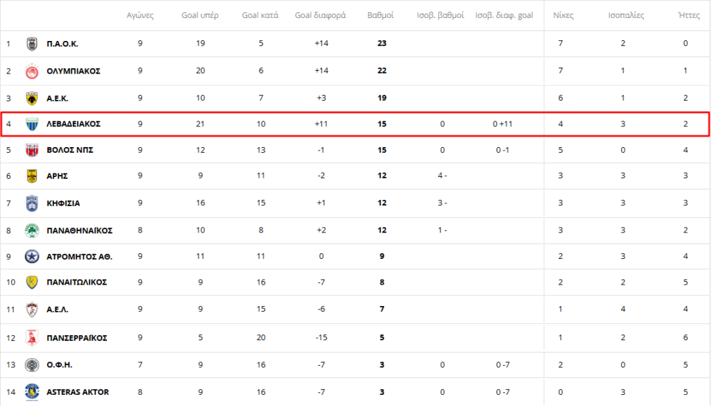 Με το διπλό κόντρα στην ΑΕΛ Novibet, ο Λεβαδειακός έφτασε στους 15 βαθμούς και βρέθηκε στην 4η θέση του βαθμολογικού πίνακα, διαθέτοντας, μάλιστα, την καλύτερη επίθεση του πρωταθλήματος (!). Συγκεκριμένα, ο πρωτοπόρος ΠΑΟΚ έχει βρει δίχτυα 19 φορές, ο Ολυμπιακός 20, η ΑΕΚ 10 και ο Λεβαδειακός 21 στη διάρκεια εννέα αγωνιστικών.