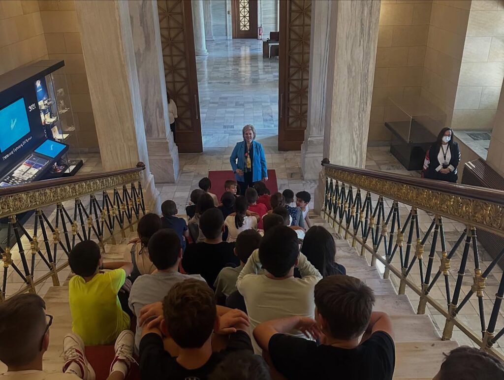 Στη συνέχεια, οι μικροί μαθητές επισκέφθηκαν τη Βουλή των Ελλήνων, όπου τους υποδέχθηκε με ιδιαίτερη χαρά η Βουλευτής Ευρυτανίας, Θωμαΐς (Τζίνα) Οικονόμου. Η επίσκεψη πραγματοποιήθηκε σε πολύ ευχάριστο κλίμα, καθώς τα παιδιά είχαν την ευκαιρία να γνωρίσουν το εσωτερικό του ιστορικού κτηρίου και να καθίσουν στα έδρανα της Ολομέλειας. Εκεί, συζήτησαν με τη βουλευτή για τη λειτουργία του Κοινοβουλίου, τον ρόλο των βουλευτών, τη διαδικασία ψήφισης των νομοσχεδίων και τη σημασία της Δημοκρατίας.