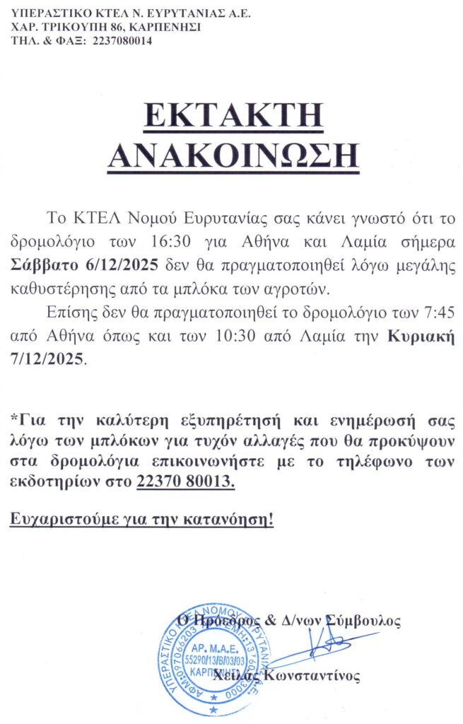 Τα αγροτικά μπλόκα που έχουν στηθεί τις τελευταίες ημέρες προκαλούν επιπτώσεις στις μετακινήσεις, με το ΚΤΕΛ Ευρυτανίας να ανακοινώνει αλλαγές και ακυρώσεις δρομολογίων για το Σαββατοκύριακο. Σύμφωνα με την έκτακτη ανακοίνωση, το δρομολόγιο των 16:30 από Καρπενησί προς Αθήνα και Λαμία το Σάββατο 6 Δεκεμβρίου 2025 δεν θα πραγματοποιηθεί, λόγω μεγάλης καθυστέρησης που αναμένεται να προκληθεί από τις κινητοποιήσεις.