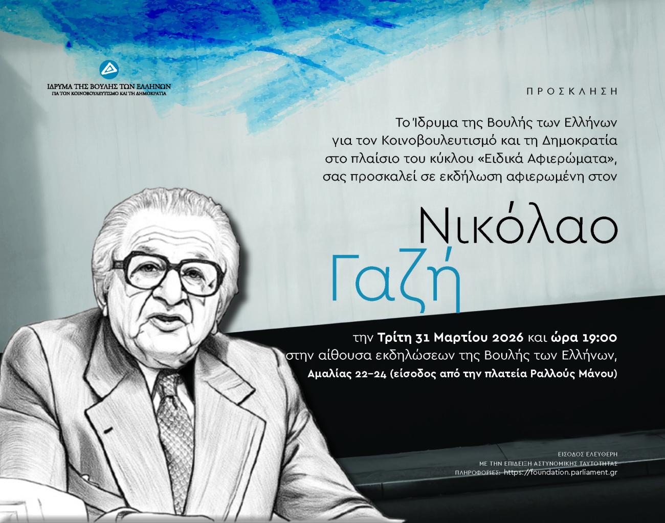 Το Ίδρυμα της Βουλής των Ελλήνων για τον Κοινοβουλευτισμό και τη Δημοκρατία στο πλαίσιο του κύκλου Ειδικά Αφιερώματα διοργανώνει εκδήλωση για τη ζωή και το έργο του Νικολάου Γαζή την Τρίτη, 31 Μαρτίου 2026 και ώρα 19:00 στην αίθουσα εκδηλώσεων της Βουλή των Ελλήνων, Αμαλίας 22-24, είσοδος επί της πλατείας Ραλλούς Μάνου.