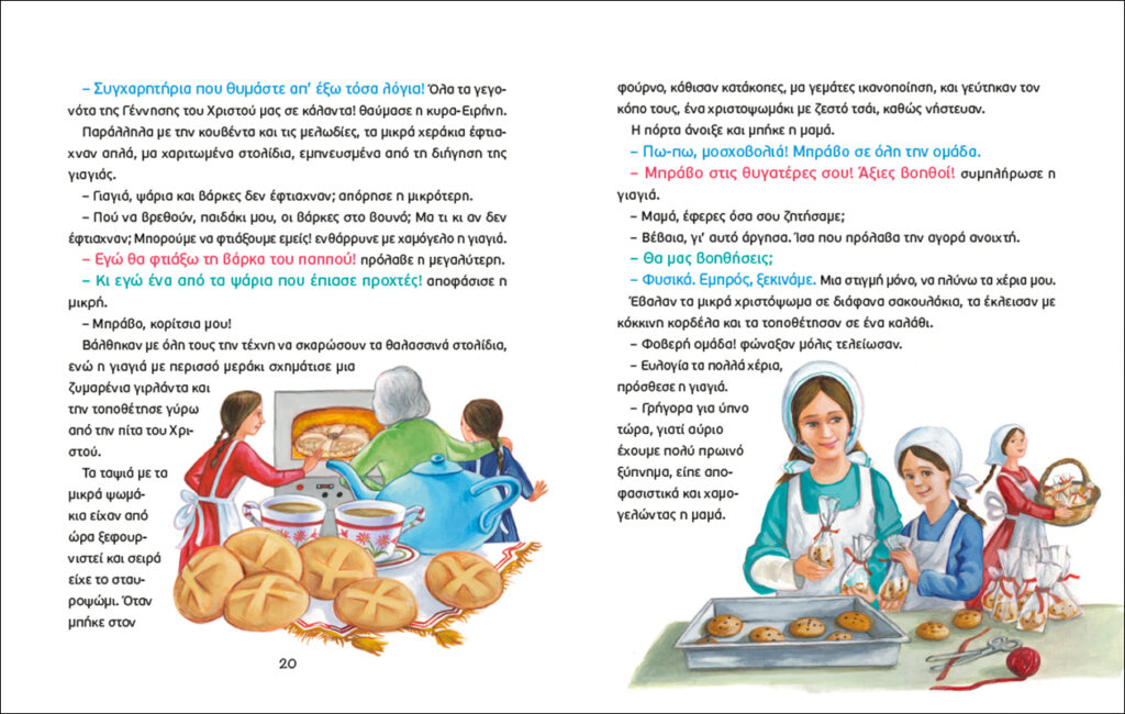 Η γιαγιά Ειρήνη, οι εγγονές της και η μητέρα τους, λίγες μέρες πριν από τα Χριστούγεννα, ζωντανεύουν το όμορφο έθιμο του Χριστόψωμου και της κολιαντίνας. Μέσα από ύμνους, τραγούδια και κάλαντα, τα κορίτσια -και μαζί τους οι μικροί αναγνώστες- μαθαίνουν για την αξία της παράδοσης, δημιουργώντας ταυτόχρονα νέες οικογενειακές αναμνήσεις γεμάτες αγάπη και χαρά.