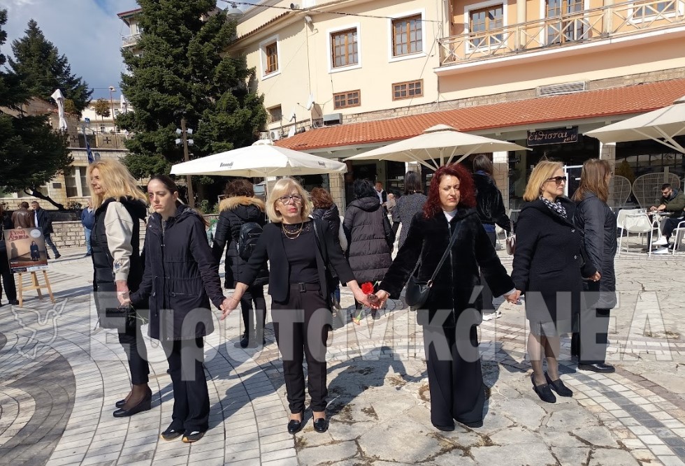 Στο κέντρο της πλατείας, γυναίκες όλων των ηλικιών στάθηκαν σε κύκλο, κρατώντας συμβολικά ένα κόκκινο λουλούδι, εικόνα που παρέπεμπε στον αγώνα για προστασία των θυμάτων και στην ανάγκη κοινωνικής αφύπνισης.