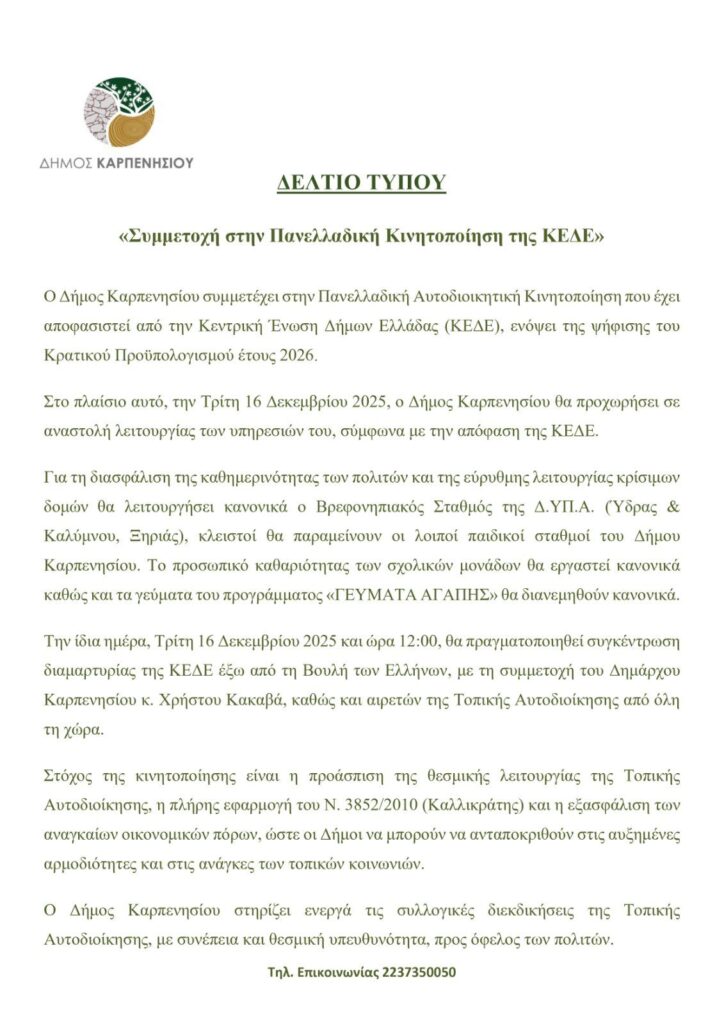 “Την Τρίτη 16 Δεκεμβρίου 2025 το Δημαρχείο Καρπενησίου θα παραμείνει κλειστό, λόγω της συμμετοχής του Δήμου στην Πανελλαδική Κινητοποίηση της Τοπικής Αυτοδιοίκησης, σύμφωνα με απόφαση της Κεντρικής Ένωσης Δήμων Ελλάδας (ΚΕΔΕ).